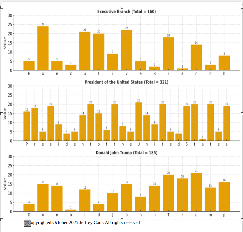 When this method is used, one branch stands apart—the Executive Branch—whose power base is singular, not collective, and whose title embodies both authority and representation. The title is “President of the United States.” (Unlike the.'Vicarius Filii Dei' conclusion which has no man associated with it.) From there, the individual who occupies that office becomes the visible head of that system. Applying Gematria to the title and the man, Donald John Trump completes the pattern, revealing the continuation of the same power that once rose before, now manifested in a different form—the second beast like the first.